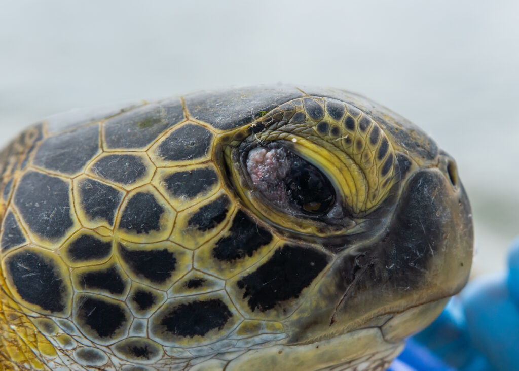 Presença de fibropapilomatose no olho de tartaruga-verde juvenil. Foto: Gabriel Marchi.