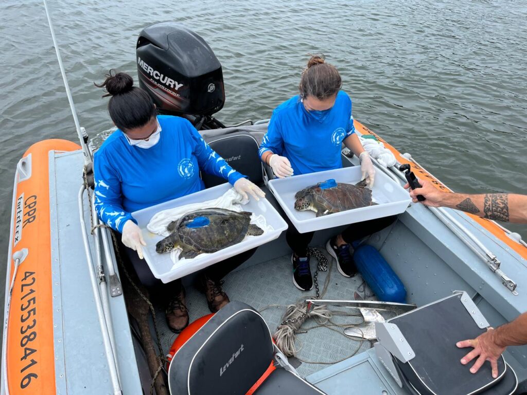 As ações com tartarugas marinhas são realizadas com um barco equipado como um ambulatório móvel. Enquanto parte da equipe cai na água, a outra fica a postos na embarcação para receber os animais. Entre os equipamentos, está a rede de emalhe, confeccionada por um pescador artesanal de Pontal do Paraná especificamente para este trabalho e com características para a captura eficiente e garantir o bem-estar dos animais, facilitando a retirada das tartarugas da rede. O manejo precisa ser rápido para evitar que as tartarugas se afoguem, pois, como têm pulmões, elas precisam subir à superfície para respirar.